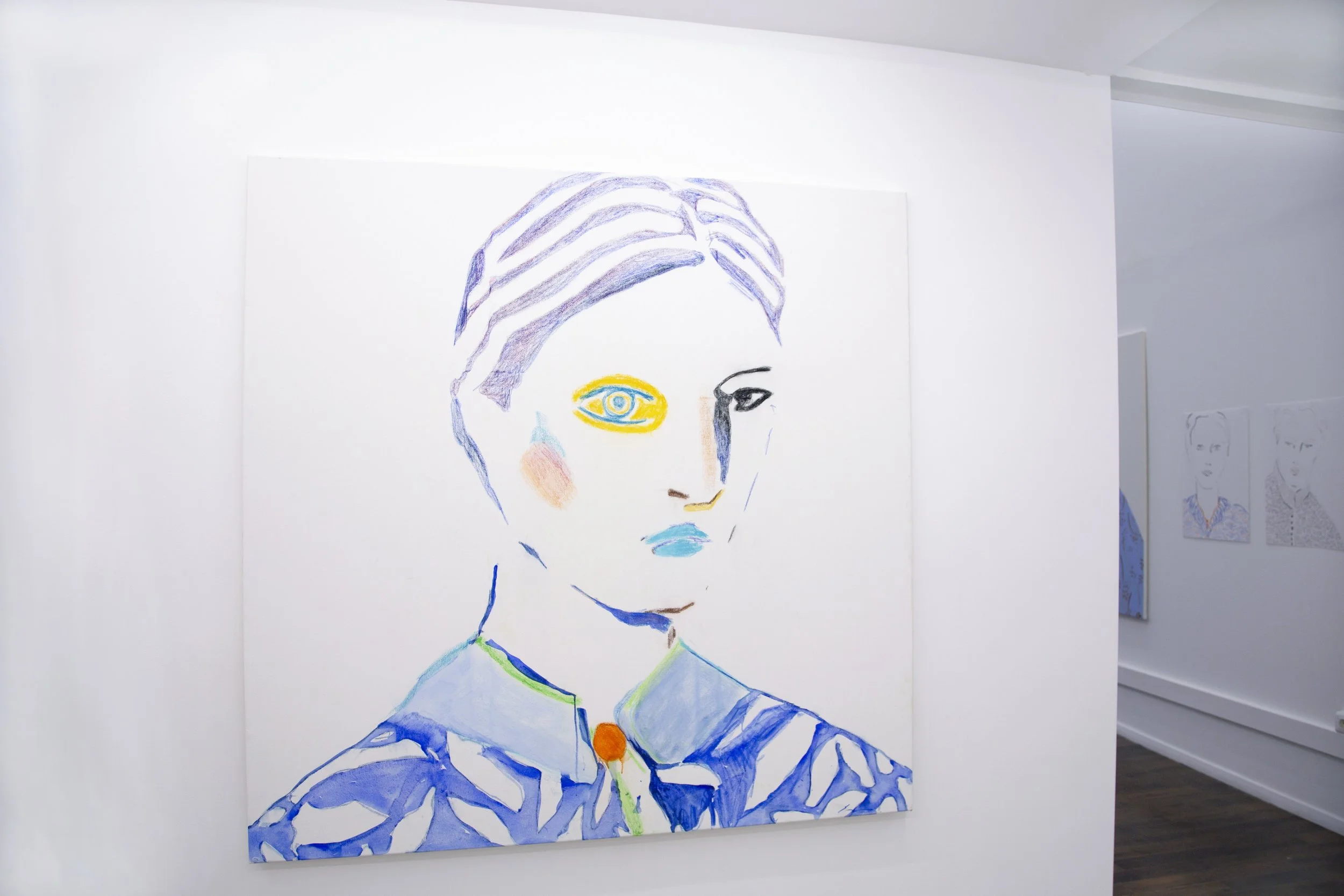 Ces derniers semblent s'exprimer à travers des couleurs et motifs vibrants sur leurs visages, des expressions mélancoliques, dissociées et aliénées; utilisant l'espace négatif de la toile blanche, pour capturer la sensation de flottement, être suspendu dans le temps, et l'espace.
